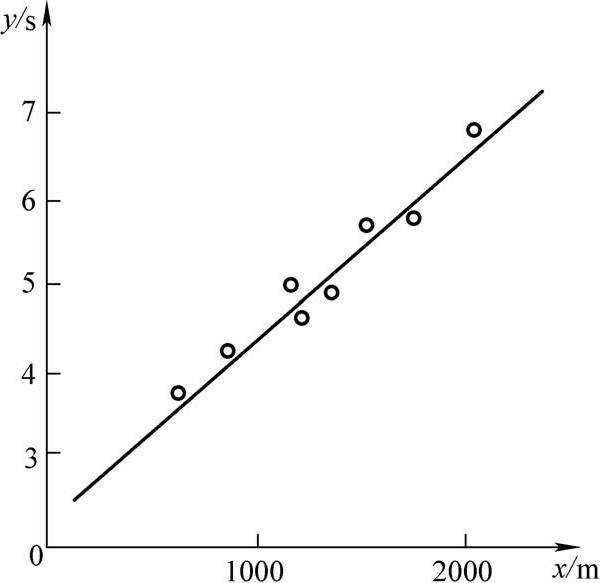 从图2-29可以看出,测试结果均落在一条直线附近,于是可以利用一条直线来表达变量之间的关系,即
