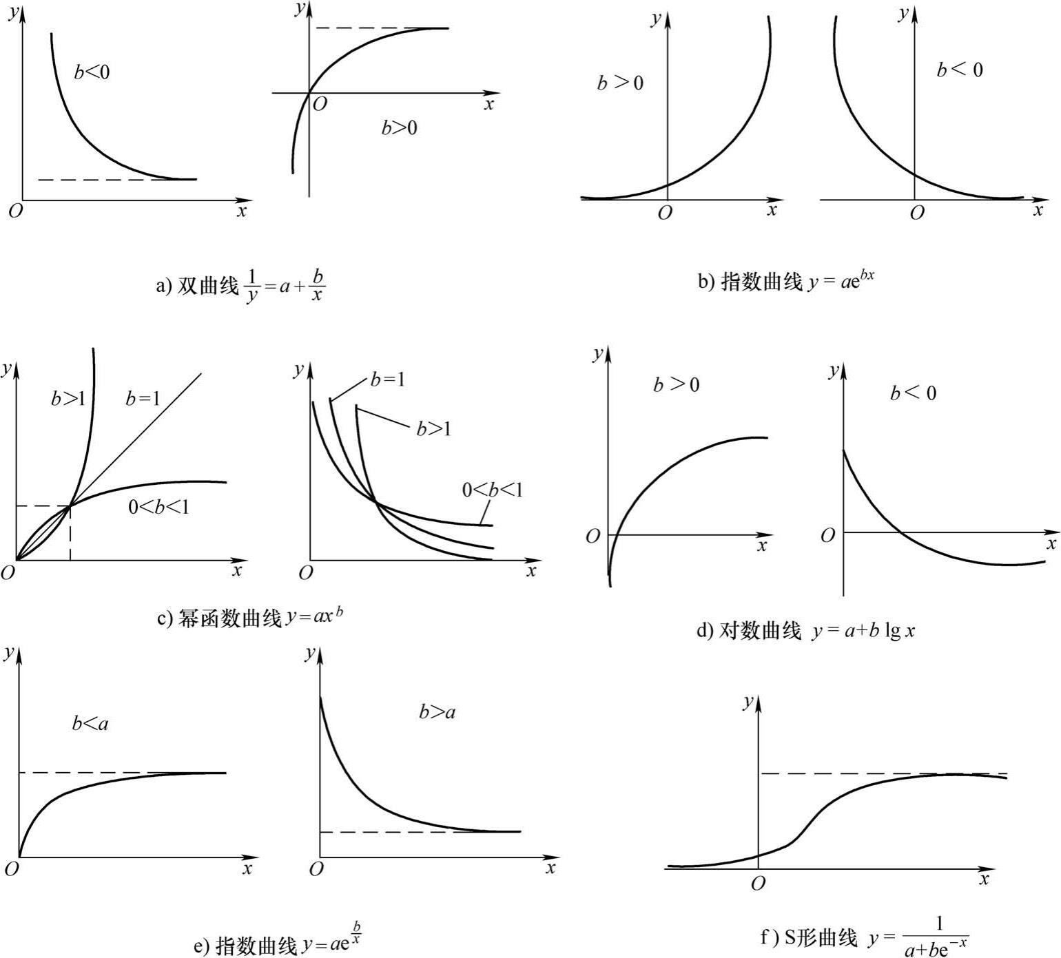 如果两个变量之间存在非线性关系,例如对数函数关系、指数函数关系和双曲线关系等,那么可以通过适当的变量变换将非线性关系转化为线性关系,然后利用前面介绍的线性回归方法进行回归处理。最后将求出的线性关系还原为非线性关系,便可得到所要求的拟合曲线。将测试结果描在坐标图上,并用光滑曲线将其连起来。将试验曲线与典型曲线(图2-30中列出了一些)进行比较,选取与试验曲线最接近的曲线方程作为经验公式的类型。