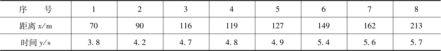 例如,某车辆在水平道路上直线行驶,根据不同的距离,测出车辆行驶的时间,对应的数值见表2-2。取距离 s 为自变量,用 x 表示;时间 t 为因变量,用 y 表示。将表2-2中的数据画在坐标图上,如图2-29所示。