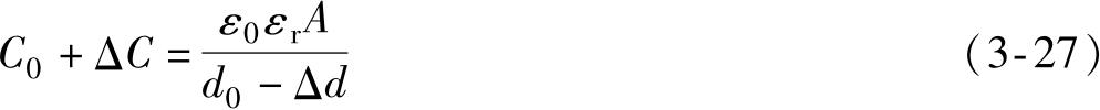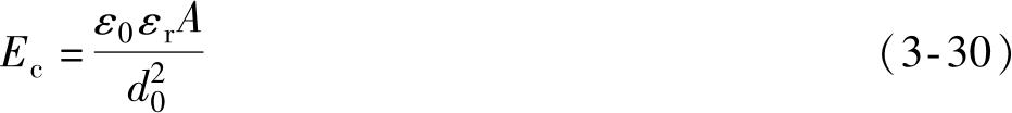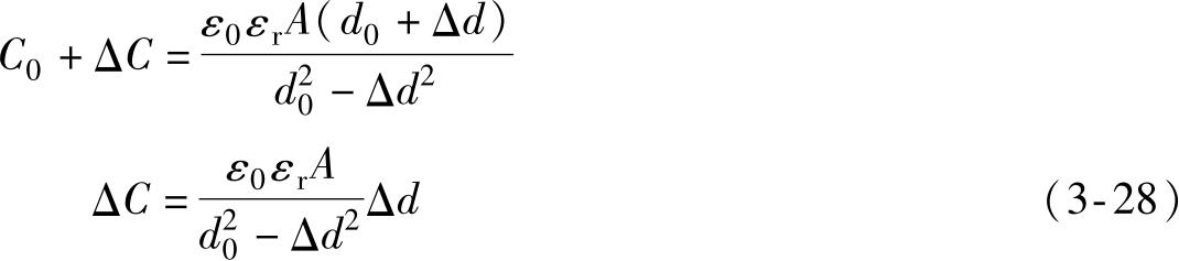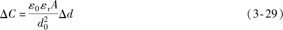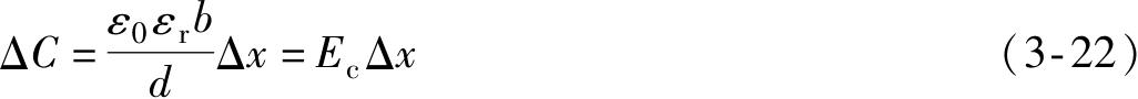 式(3-30)表明,当Δ d 很小时, d 型电容式传感器的灵敏度与极板间距的二次方成反比,即极板间距越小,灵敏度越高。但当灵敏度提高时,非线性误差亦随之增大。此外,若增加 d 0 时,灵敏度 E c 迅速减小,这表明此传感器的测量范围非常有限。