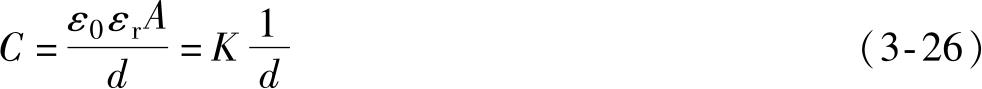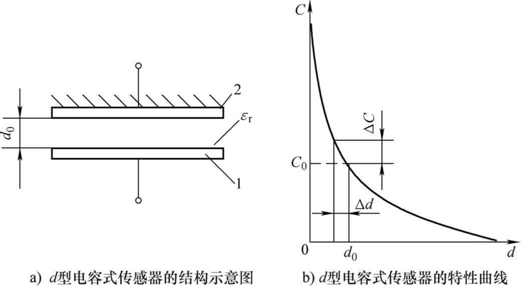 由式(3-26)可知,当电容器极板间距 d 变化时,电容量随 d 的变化规律是一曲线,如图3-13b所示。