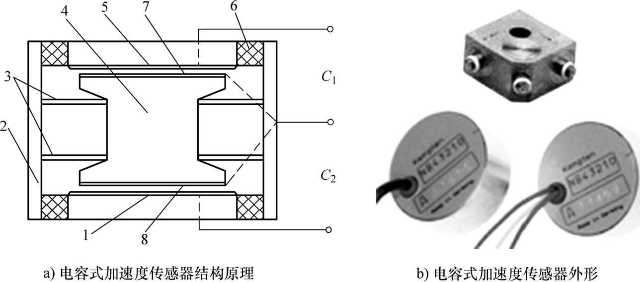1—下固定极板 2—外壳 3—弹性支撑钢片 4—质量块5—上固定极板 6—绝缘垫 7、8—上、下活动极板
