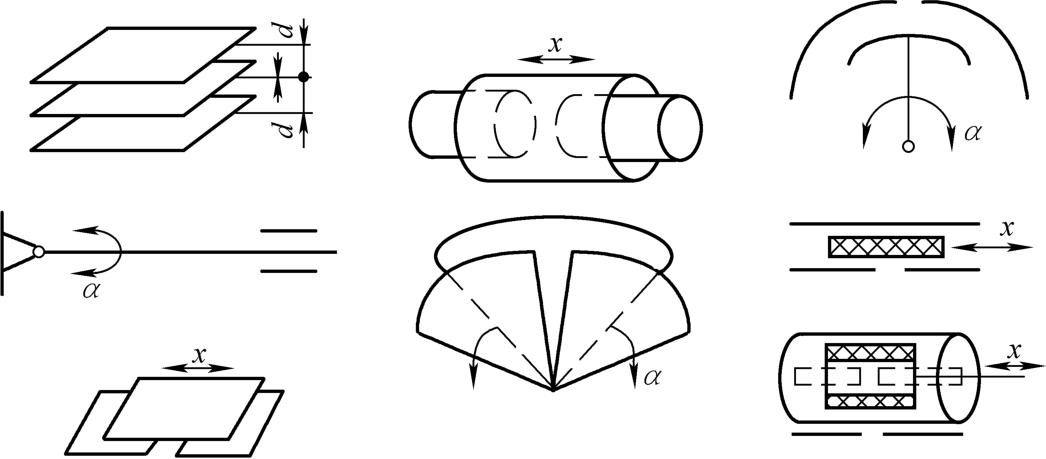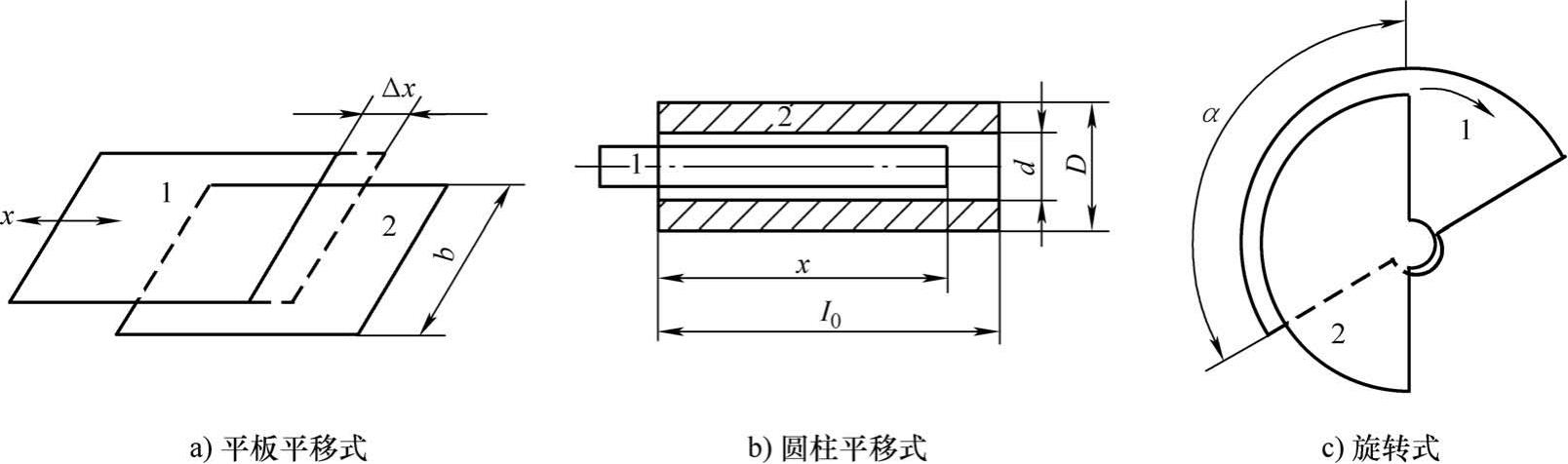 图3-12是3种不同形式的 A 型电容式传感器,即平板平移式、圆柱平移式和旋转式电容传感器。