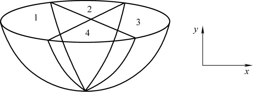 将图3-20所示的传感器按图3-21所示的方法将其分成4个参数完全相同的电容器1、2、3、4,并将电容器1和3、2和4分别连成2个差动式结构。显然,由电容器1和3组成的差动式 ε r 型电容传感器可测量绕 y 轴的倾角 α ,由2和4组成的差动式 ε r 型电容传感器可测量绕 x 轴的倾角 β 。这种传感器在各工程领域的应用十分广泛,如航空、航天器的飞行姿态控制、汽车四轮定位参数的测量、高层建筑及桥梁施工的倾斜量测量等。
