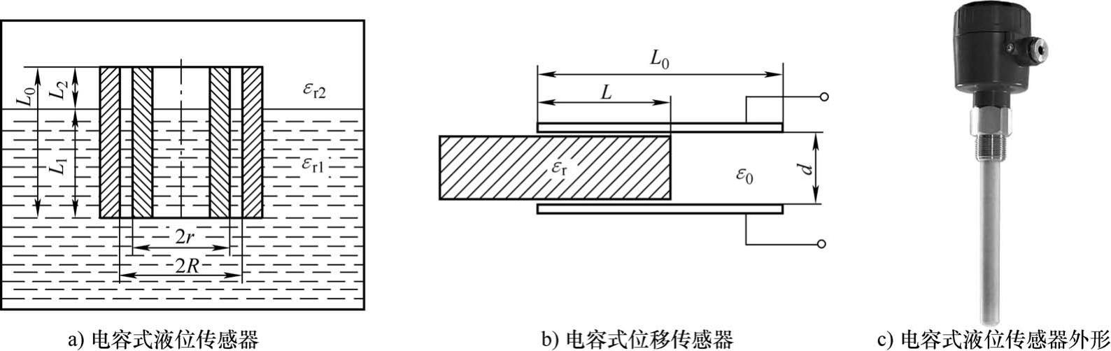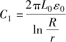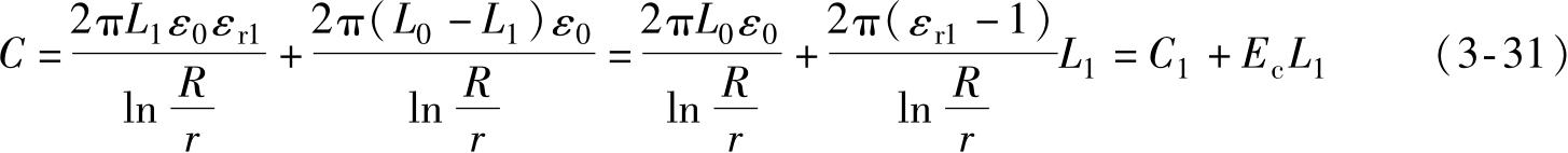 设图3-14a中传感器两圆筒形极板的长度为 L 0 ,内极板的外径为2 r 、外极板的内径为2 R ,极板间的液体介质为非导电液体,其介电常数为 ε r ,极板间未被液体浸泡的部分是空气,其介电常数 ε r2 =1,极板被液体介质浸泡的深度为 L 1 ,此时该电容式传感器的输出电容