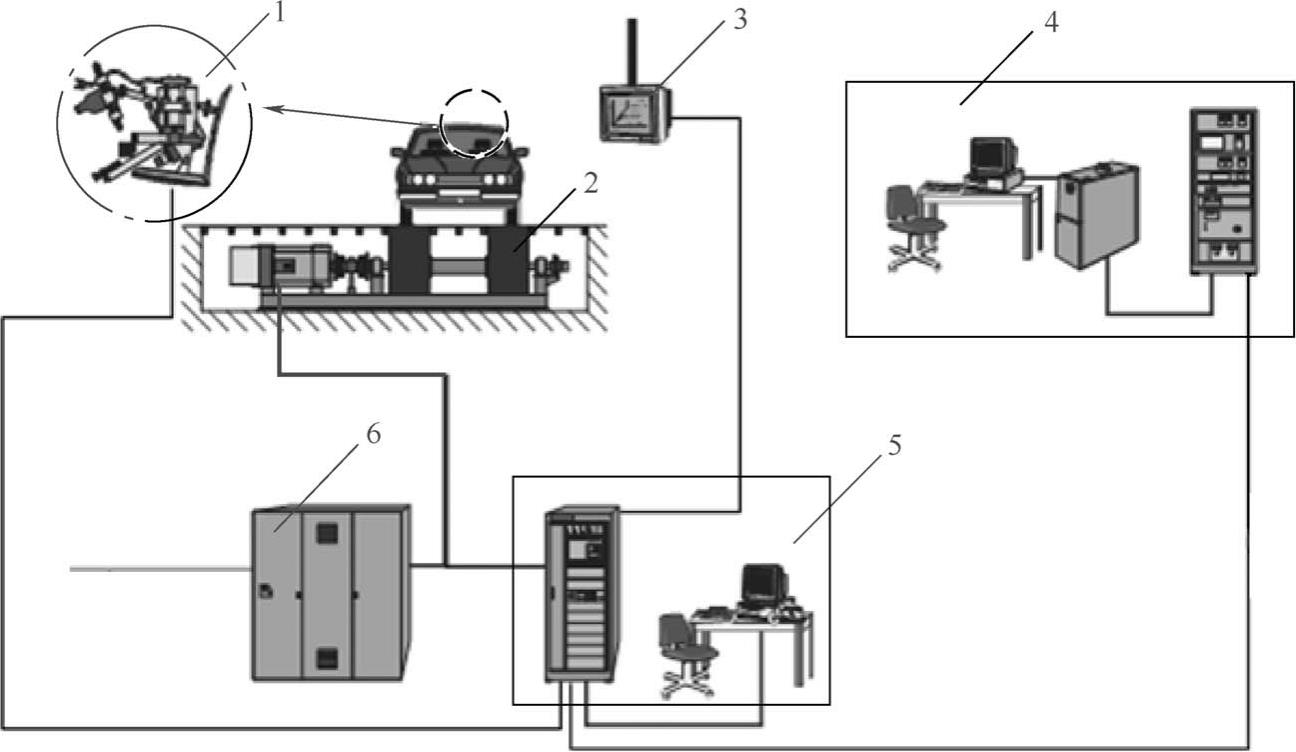 1—自动驾驶仪 2—底盘测功机 3—显示器 4—实验室中心机房 5—主控计算机 6—电源柜