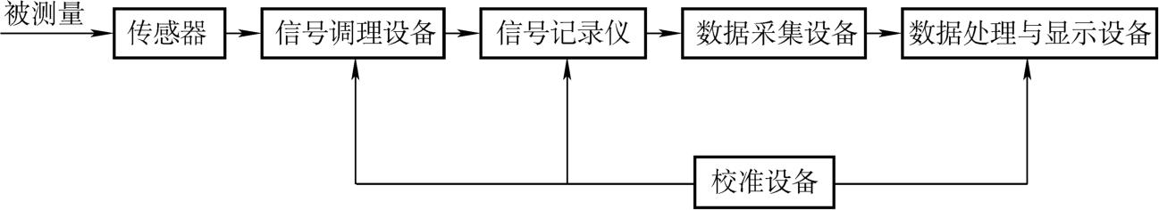 对汽车部件功能、生产工艺的验证,零件形体、成分的检测,汽车整车及零部件性能的测试等统称为汽车试验。汽车试验所涉及的范围十分广泛,渗透到汽车产品研发、样机试制、成品制造的各个环节。试验目的、要求、对象不同,试验系统的复杂与难易程度也存在很大的差异,对于汽车零件形体外形尺寸与质量大小的测量,在此不作讨论。本章所要解决的是一些较为复杂的汽车整车及零部件的性能参数测试问题,往往需要由传感器、信号调理、信号记录、数据采集、数据处理与显示等设备所组成的复杂系统才能完成,如图2-1所示。