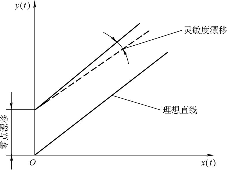 漂移分为零点漂移和灵敏度漂移。漂移通常都是由温度的变化及元器件性能的不稳定所引起。图2-4是零点漂移和灵敏度漂移的示意图。对于一般的测试系统,灵敏度越高、测量范围越小,稳定性相对较差,即漂移相对较明显。