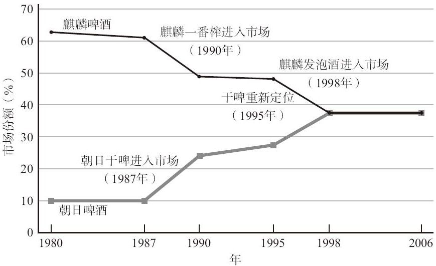 1994年,作为市场唯一干啤品牌生产商的朝日公司,基于其干啤口味清新、日本排名第一以及全球知名的特点,制定了一项非常有力的子类产品定位战略。朝日公司在努力提升其干啤子类产品,与此同时麒麟公司却在破坏其拉格淡啤酒子类产品。也许是被朝日公司“第一生啤”的口号激怒了,麒麟公司也开始转向生啤生产,并且把麒麟拉格更换为“麒麟拉格生啤”(Kirin Lager Draft,原来的拉格淡啤酒更名为“麒麟经典拉格”(Kirin Lager Classic),仍旧在市场上销售,但降级为小众产品)。麒麟公司的本意是利用麒麟拉格生啤加大其对年轻受众的吸引力,但适得其反——它的产品形象变得令人迷惑,导致其核心客户群心生不满。这场1995~1998年发生在拉格啤酒和干啤酒之间的子类产品大战,最终结果是朝日超爽干啤的市场份额增加了8个百分点,攀升至35%,而麒麟啤酒却缩水9个百分点,降至39%。