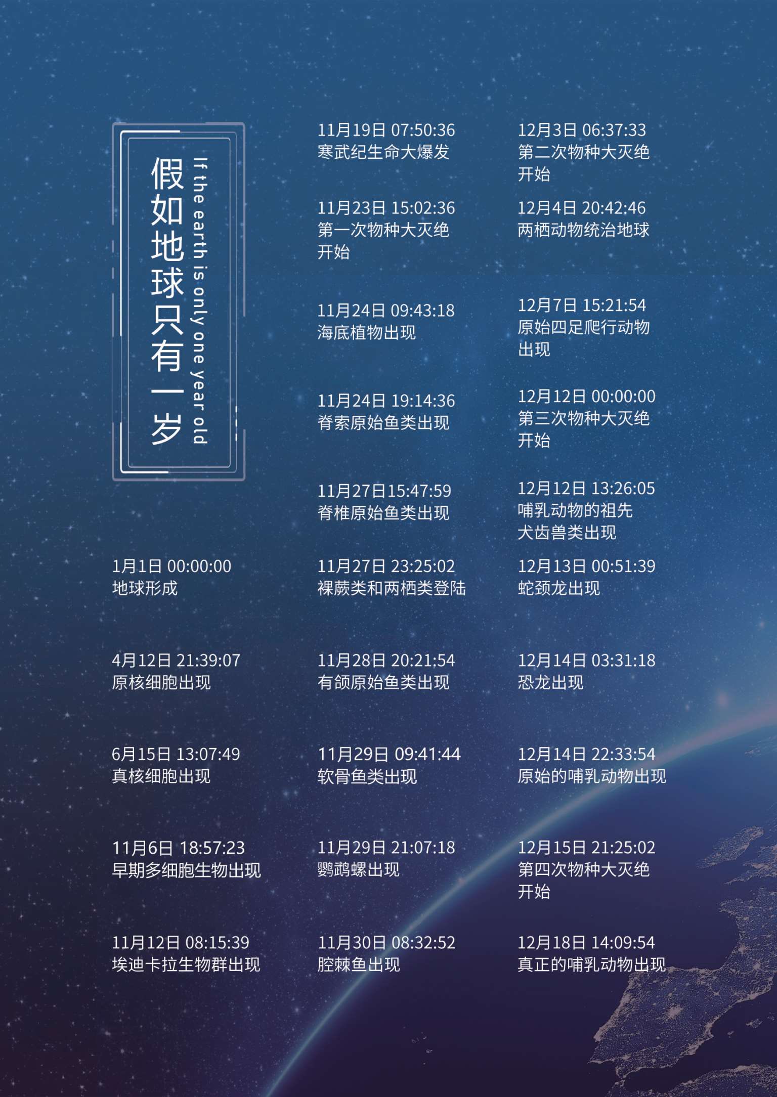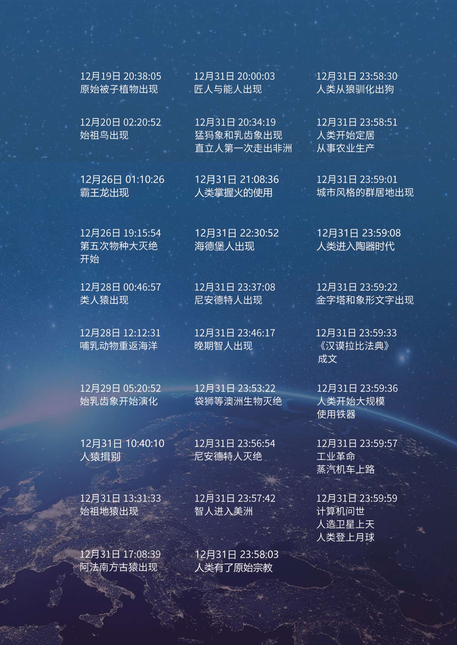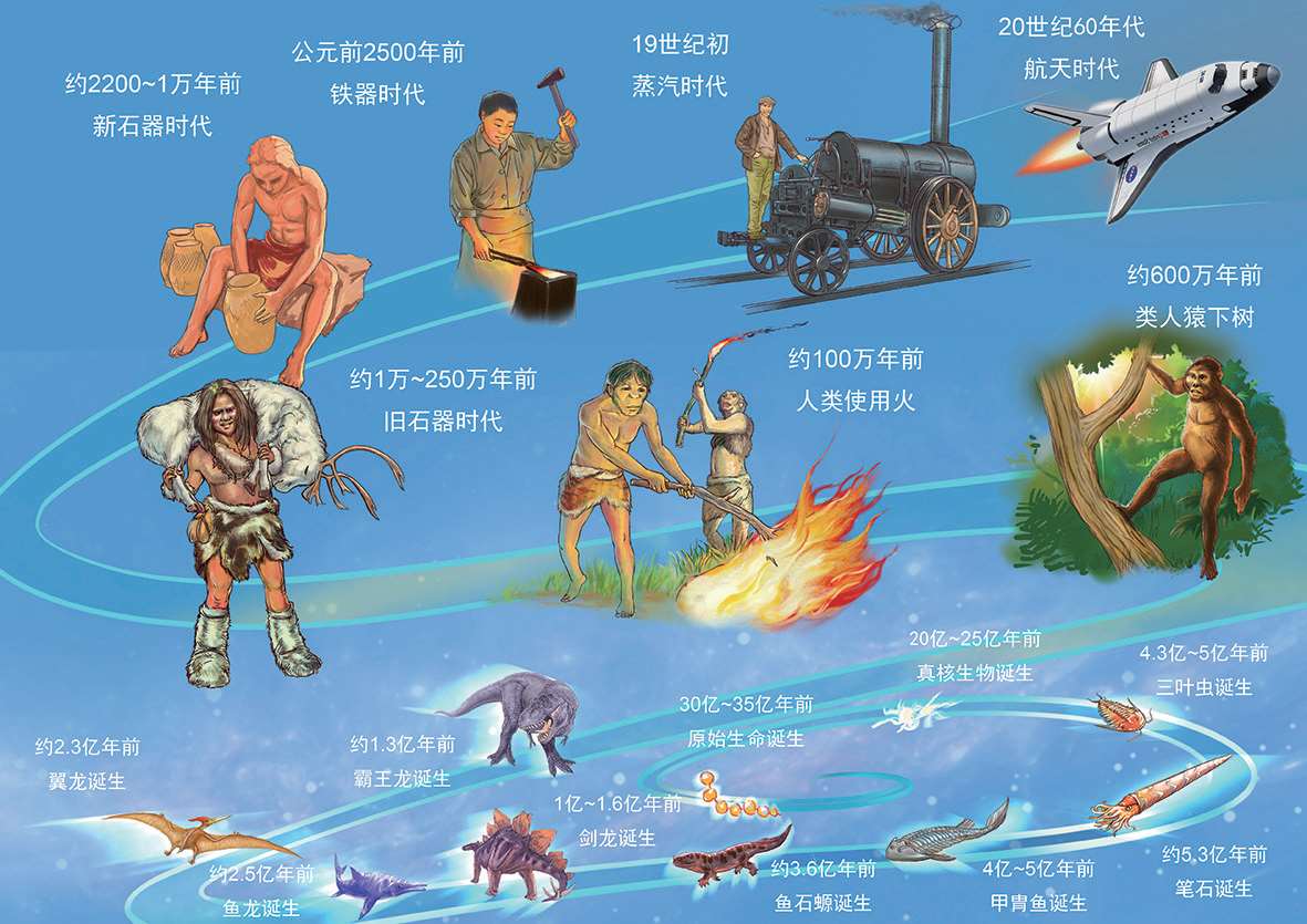 纵使再奋力向前追溯,人类起源也只能设到300万~700万年前,这就是所谓的“人猿相揖别,只几个石头磨过”。若是按照人类文明史算,更是只有短短的几万年时间。也就是说,到了最后一天的午夜,万物之灵才披挂上阵。