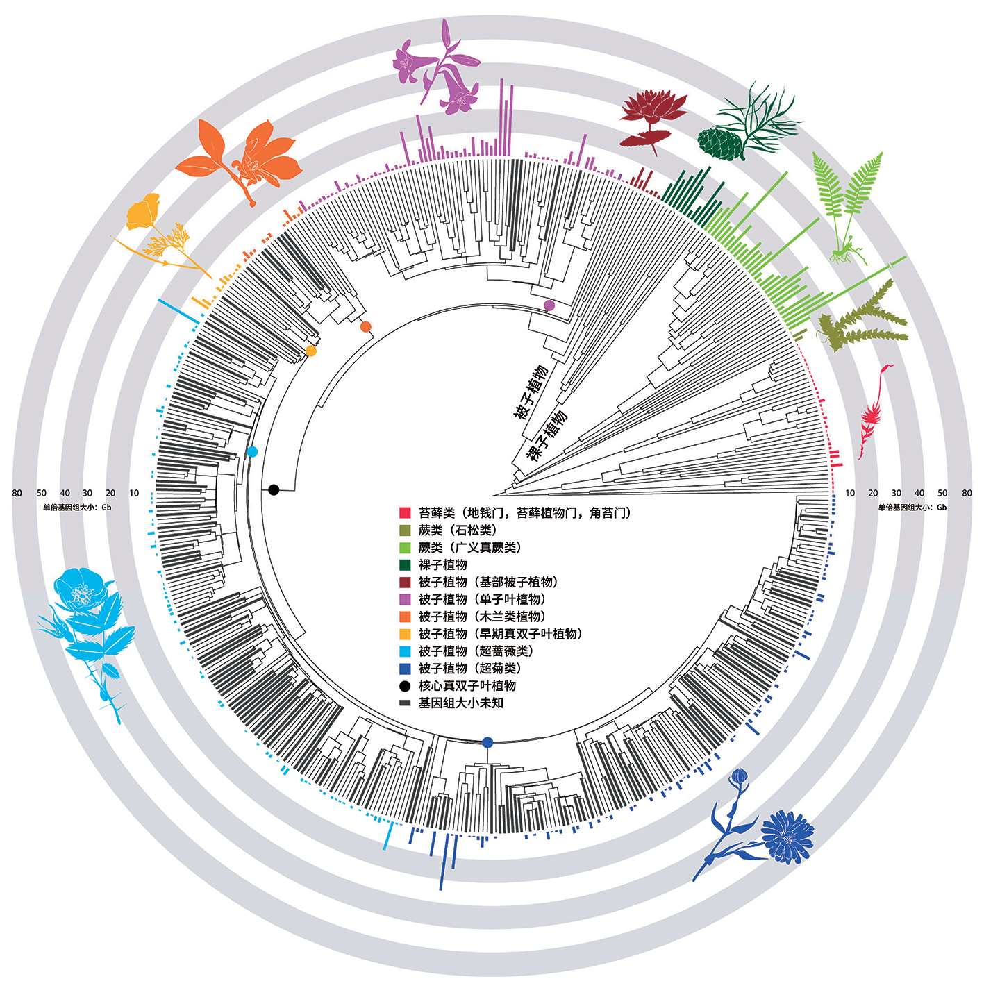 (内圈是以苔藓植物为起点构建的陆生植物系统发育树,最小分支单元为科,各科按演化出现的时间先后顺序在图中逆时针排布;外圈有色条柱,高度代表该科平均基因组大小,单位Gb;内圈加粗的灰色分支对应的外圈基因组大小数值暂缺。数据引自:Jaume Pellicer, et al., Genome Size Diversity and Its Impact on the Evolution of Land Plants)