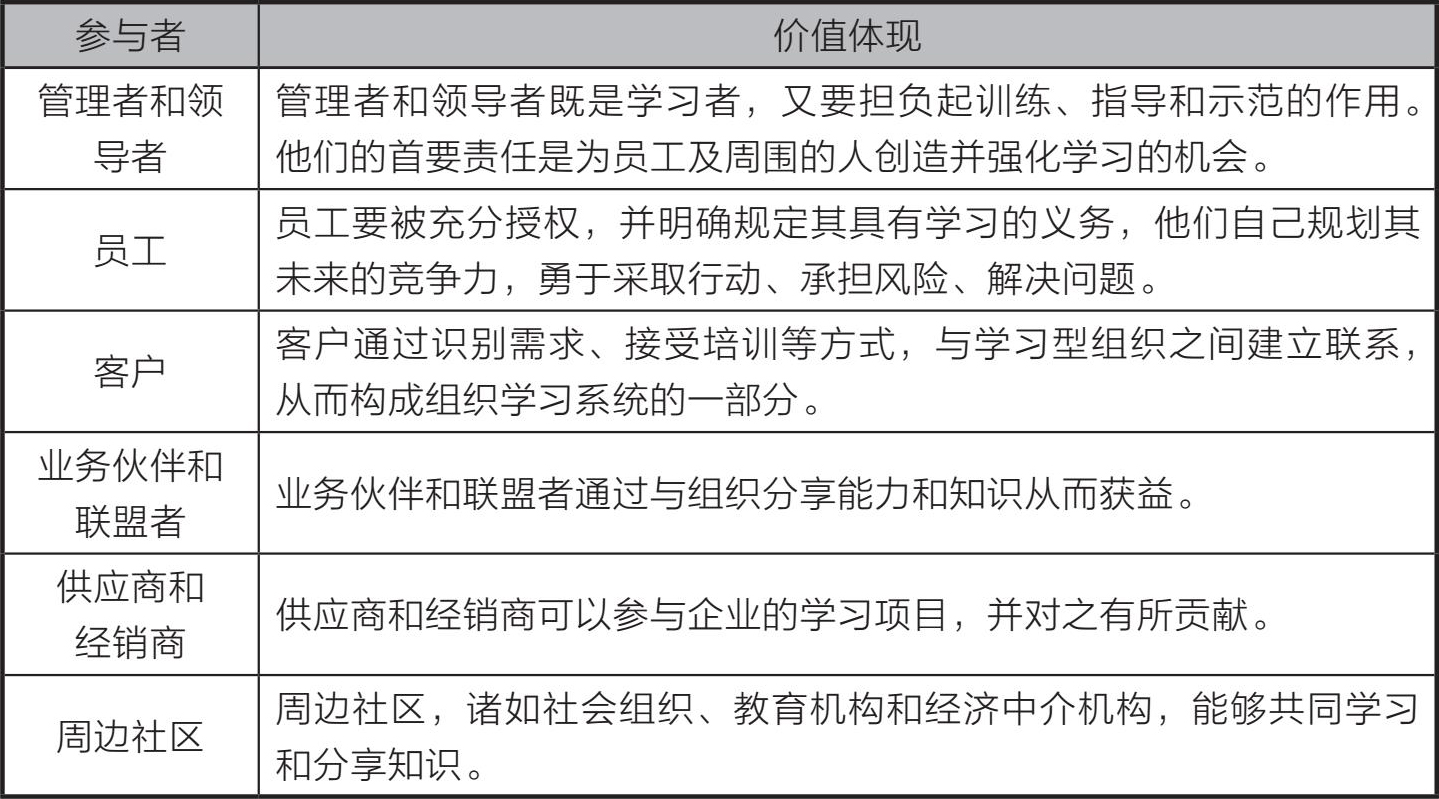 学习型组织中人员子系统包括管理者和领导者、员工、客户、业务伙伴和联盟者、供应商和经销商、周边社区等。每一个群体对于学习型组织来说都很有价值,必须充分地予以授权,并促使其学习。他们之间的关系如表1-3所示。