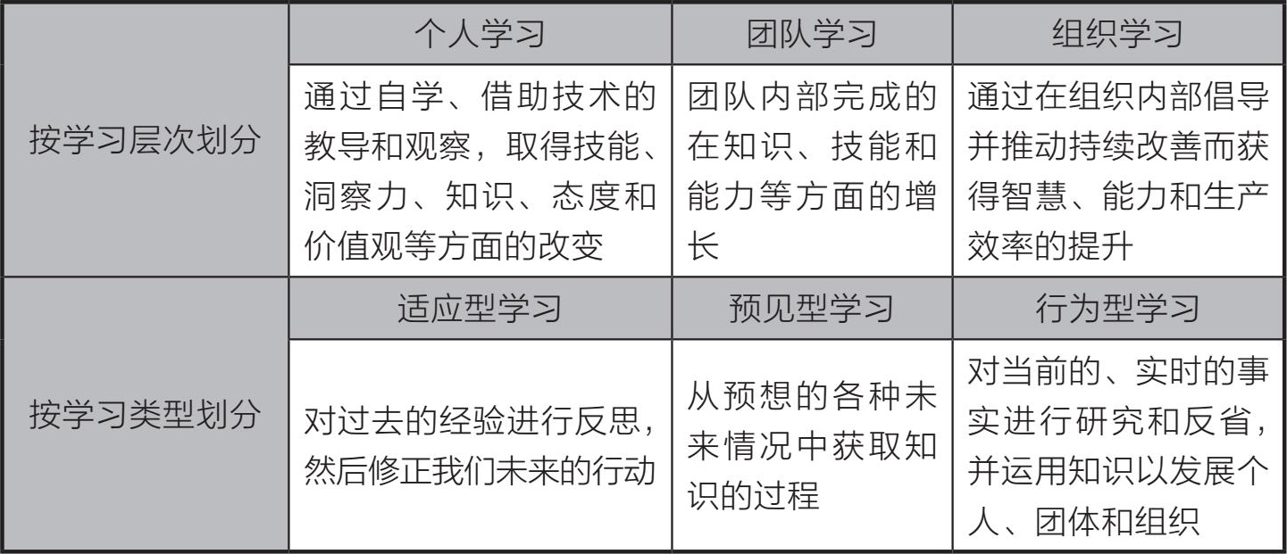 学习子系统是学习型组织的核心要素,审视了学习的层次、类型与技能(即彼得·圣吉的五项修炼),尤其是对行为学习法进行了详细论述。按学习层次划分,包括个人学习、团队学习和组织学习三个互不相同却又互相关联的层次。按学习类型划分,包括适应型学习、预见型学习和行为型学习三种。虽然每一种都有差别,但三者之间也经常相互交叠、互为补充。如表1-1所示。