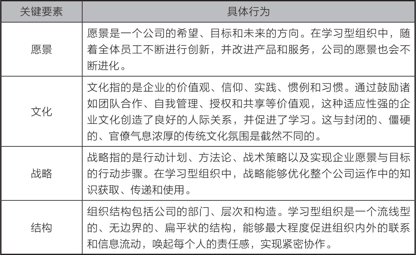 组织本身包含了各种要素和过程,它也是学习型组织的一个子系统。这个子系统包含四个关键要素:愿景、文化、战略和结构。如表1-2所示。