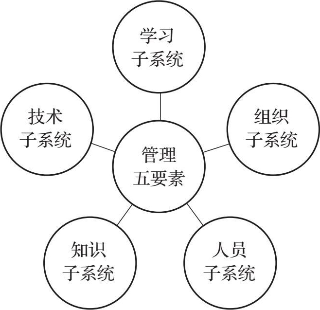 “学习型组织系统”模型是一个理解和构建学习型组织的综合模型。在该模型中,包括五个子系统,即学习子系统、组织子系统、人员子系统、知识子系统和技术子系统,它们动态关联、彼此互补,并相互支撑、共同聚力,促进组织学习的发生和发展。这五个子系统也被称为学习型组织的管理五要素。如图1-6所示。