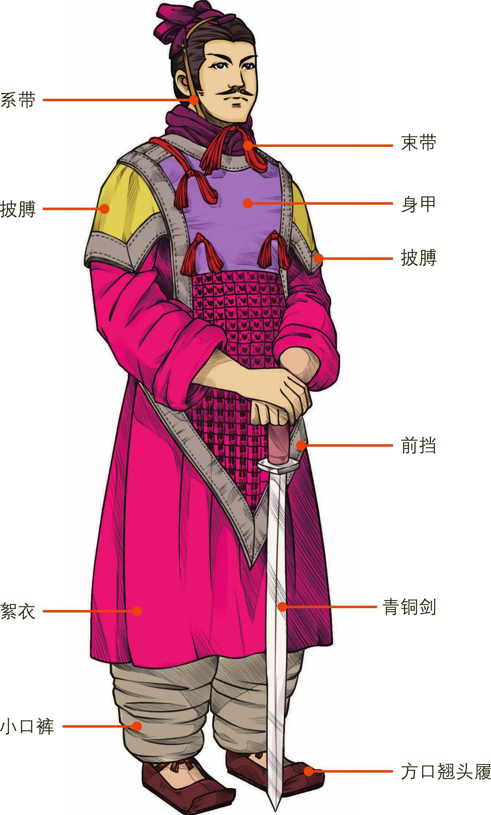 秦朝武将的铠甲由身甲、披膊和前挡这三个部分构成。身甲的上部和披膊使用整块皮革制成;下半部分和前挡用皮甲片编缀,肩部、脸部和腰部系有红色系带。铠甲的镶边多为白色、中黄色和朱红色。铠甲里面穿着棉袍和小口裤。士兵头发梳成发髻,发髻上罩有介帻,脚穿方口翘头履。