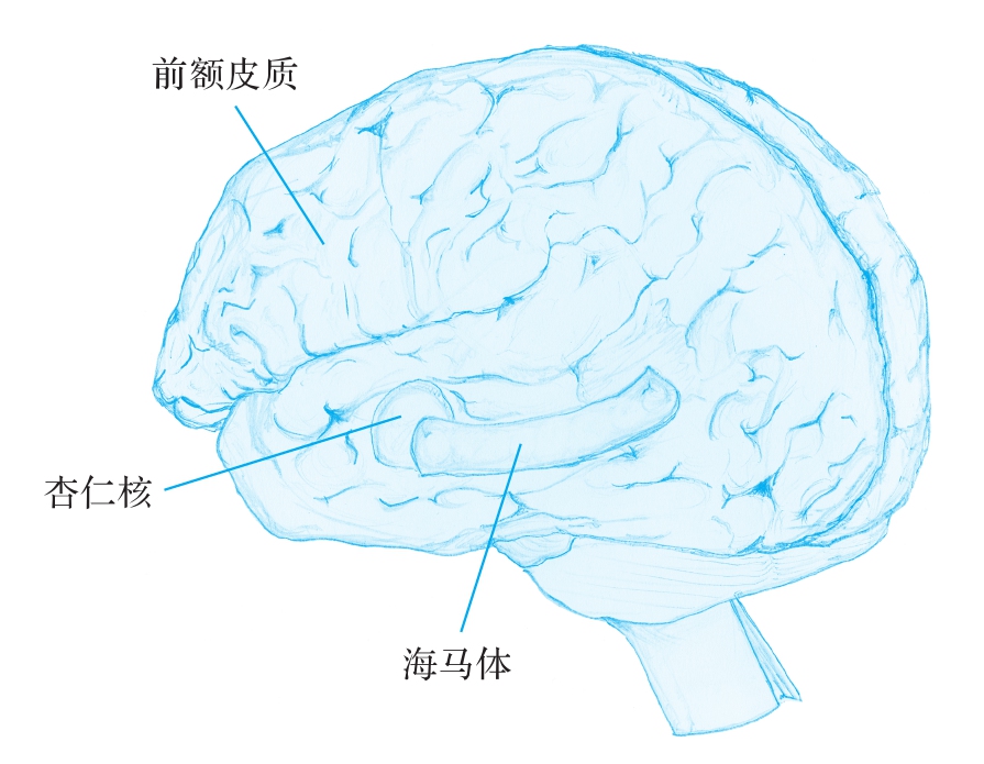 图1-1 有三个重要的脑结构能够帮助调节压力和控制冲动,它们分别是前额皮质、杏仁核和海马体
