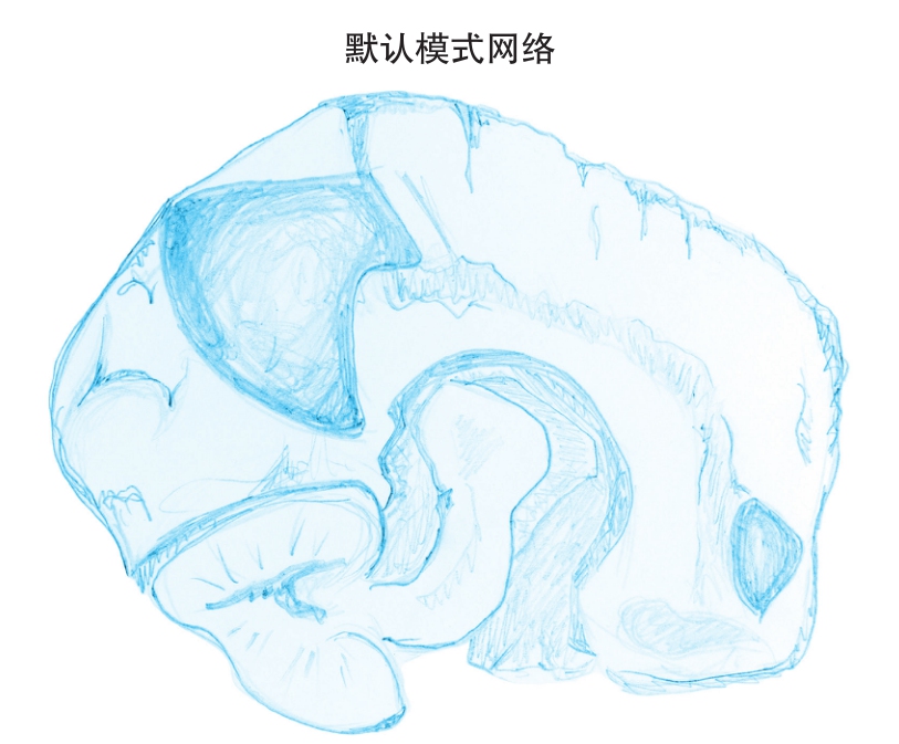 多年来,科学家都使用核磁共振成像技术来评估大脑的活动,他们会给大脑提供一项具体的任务(比如从一千开始倒数),随后再研究到底是什么东西激活了大脑。但是在21世纪之交,科学家开始研究我们在和自己的思绪静静独处时,大脑里会发生些什么。他们的研究发现,在大脑中存在一个复杂而高度整合的网络,只有当我们“什么都不做”的时候才会被激活,这被称为“默认模式网络”(见图1-2)。我们对它的功能的理解还很初级,但我们已经知道,它一定至关重要,因为这个网络消耗了大脑所用能量的60%~80%。