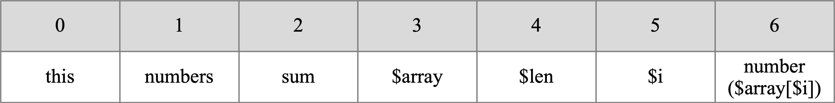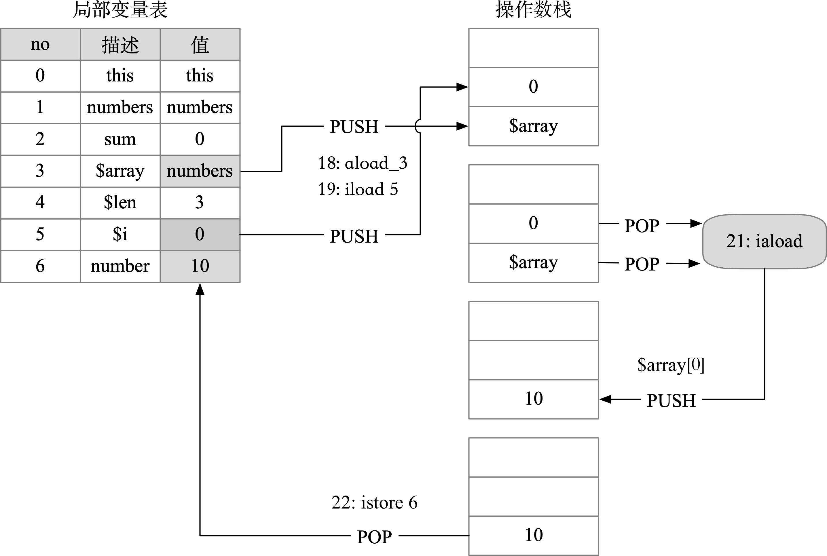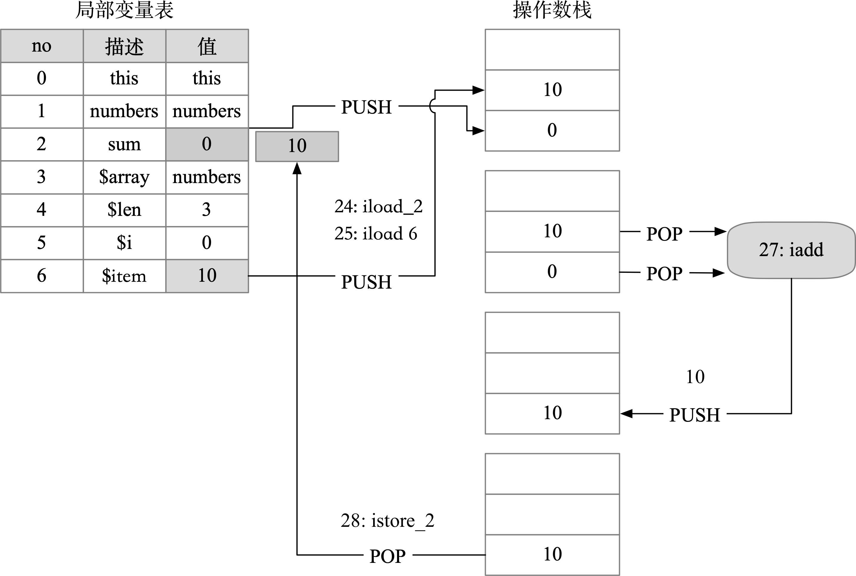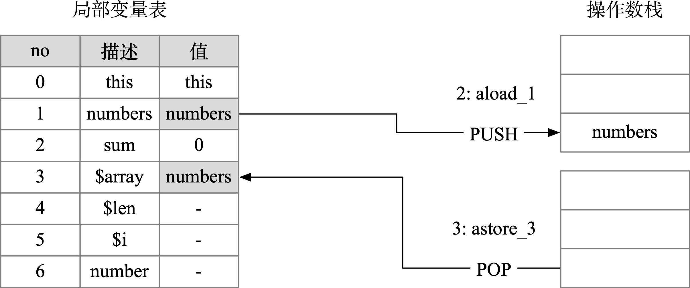 下面以numbers数组内容[10,20,30]为例来讲解上述的字节码的执行过程。