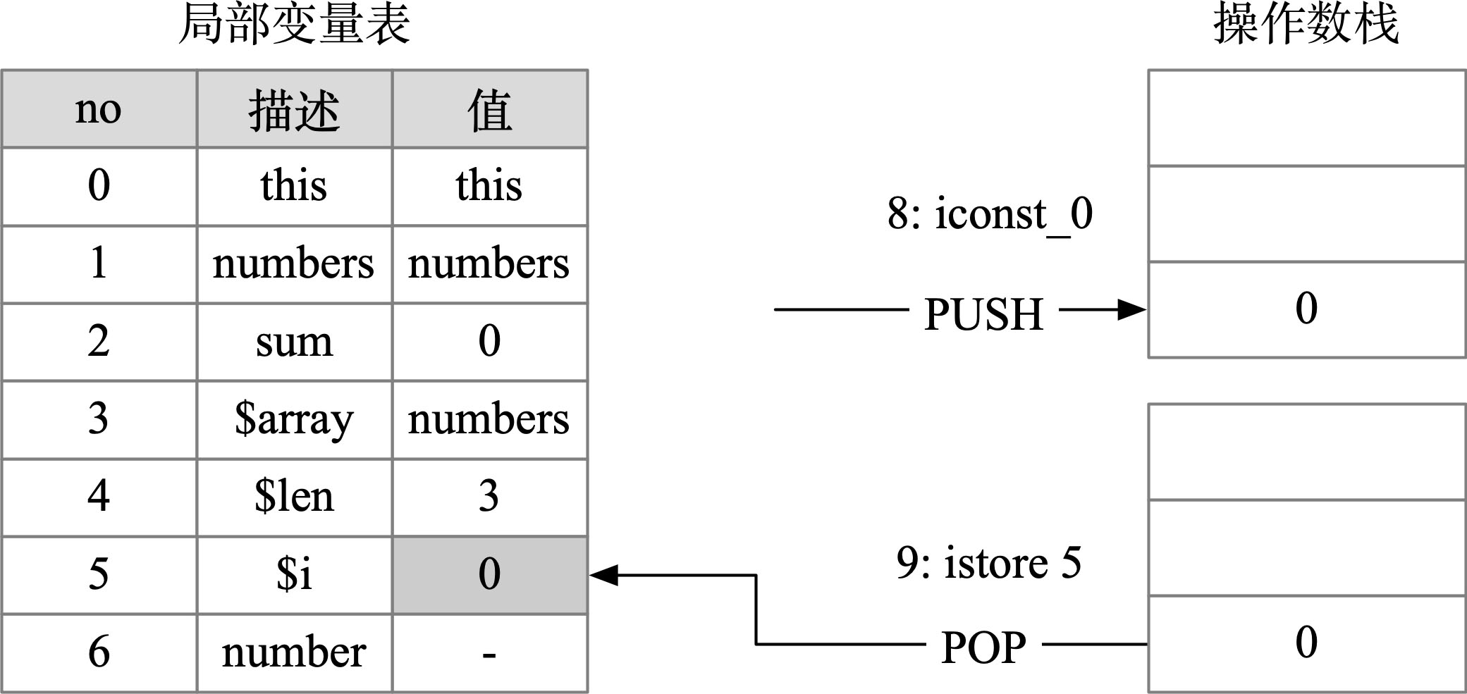 第8~9行:初始化数组遍历的下标初始值。iconst_0将0加载到操作数栈上,随后istore 5将栈顶的0存储到局部变量表中的第5个位置,这个局部变量是数组遍历的下标初始值,记为$i,如图2-18所示。