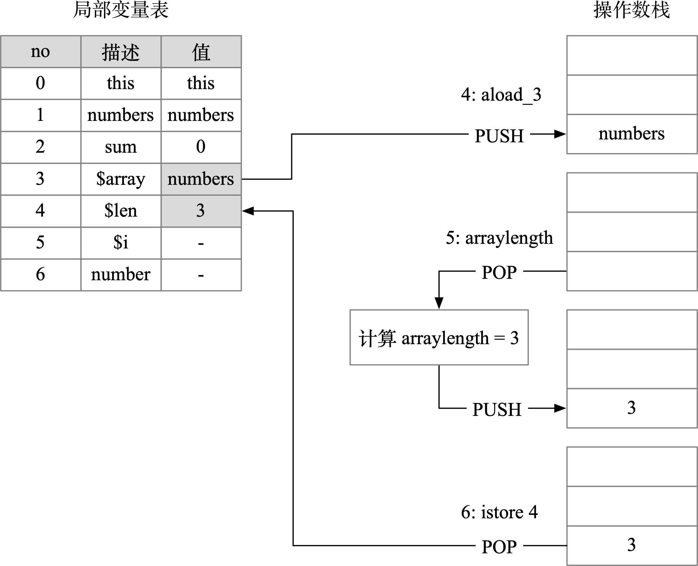 第4~6行:计算数组的长度,astore_3加载$array到栈顶,调用arraylength指令获取数组长度存储到栈顶,随后调用istore 4将数组长度存储到局部变量表的第4个位置,这个变量是表示数组的长度值,记为$len,过程如图2-17所示。