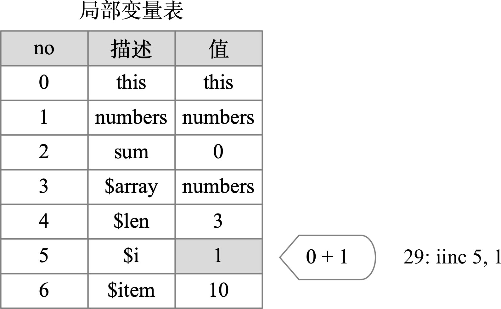 第29行:“iinc 5,1”指令对执行循环后的$i加一。iinc指令比较特殊,之前介绍的指令都是基于操作数栈来实现功能,它则是直接对局部变量进行自增,不用先入栈、执行加一操作,再将结果出栈存储到局部变量表,因此效率非常高,适合循环结构,如图2-22所示。