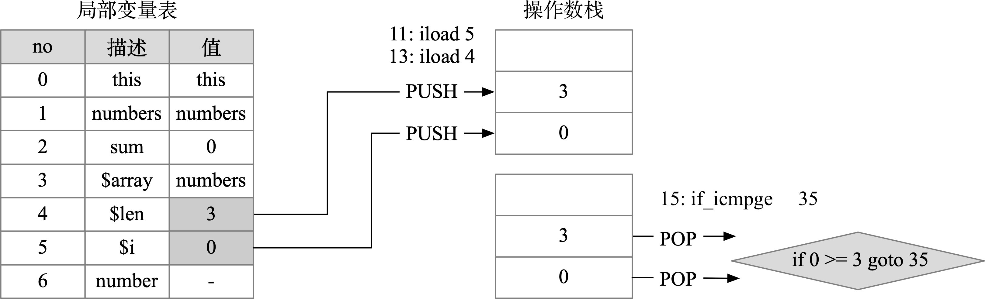 首先通过iload 5和iload 4指令加载$i和$len到栈顶,然后调用if_icmpge进行比较,如果$i>=$len,直接跳转到第35行指令处,for循环结束;如果$i<$len则继续往下执行循环体,可以用如下伪代码表示。