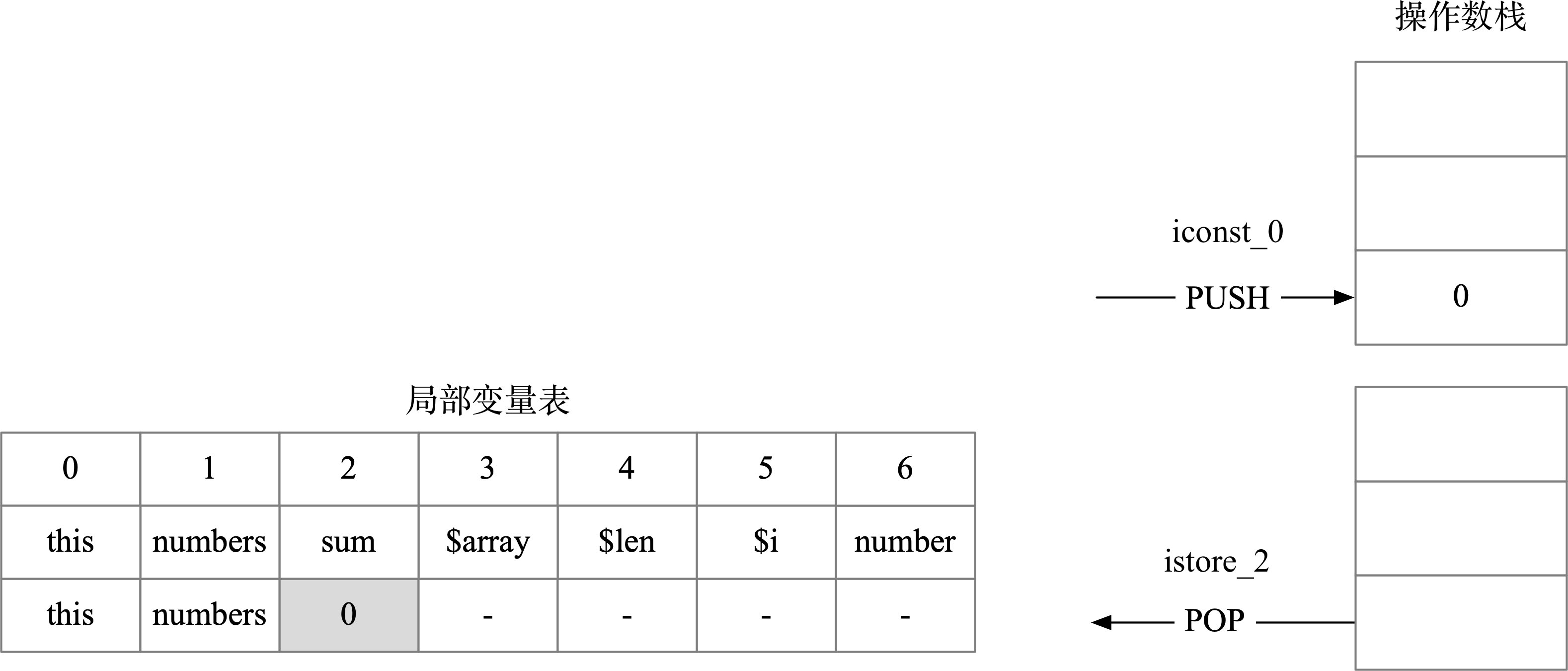 第0~1行:把常量0加载到操作数栈上,随后通过istore_2指令将0出栈赋值给局部变量表下标为2的元素,也就是给局部变量sum赋值为0,如图2-15所示。