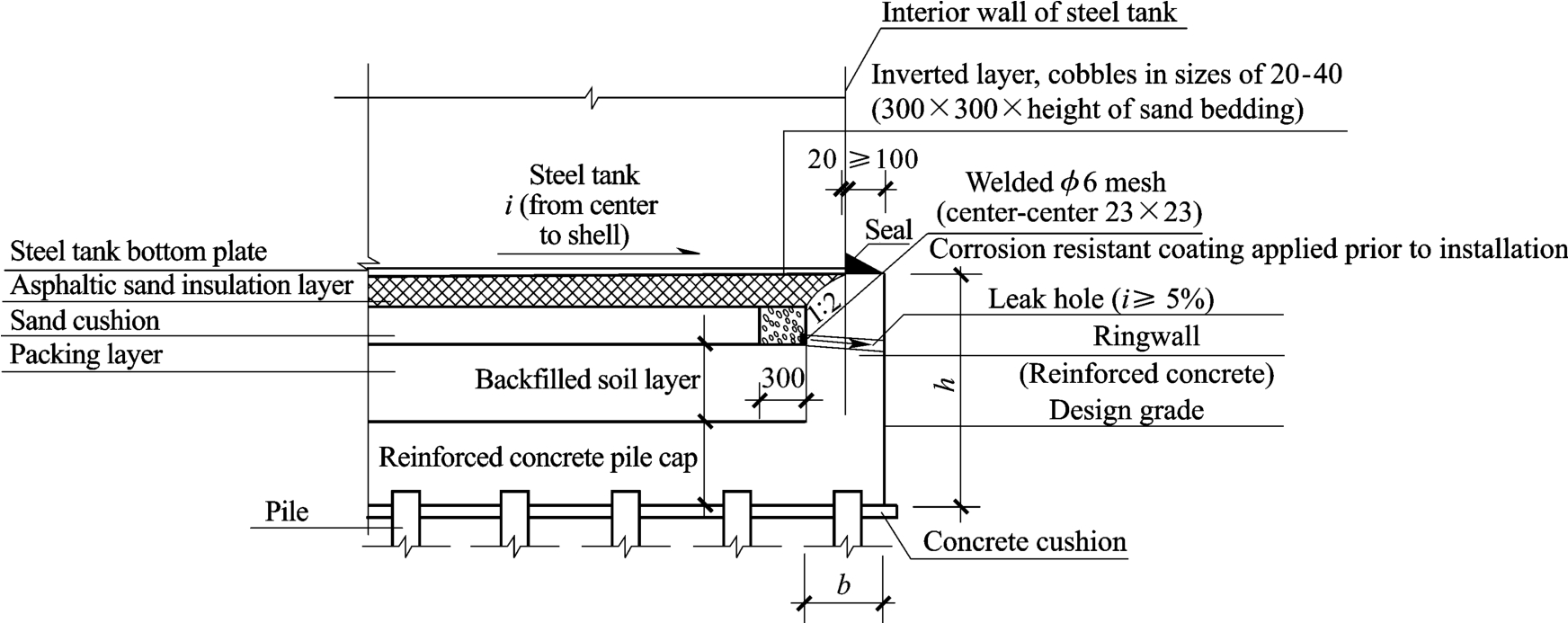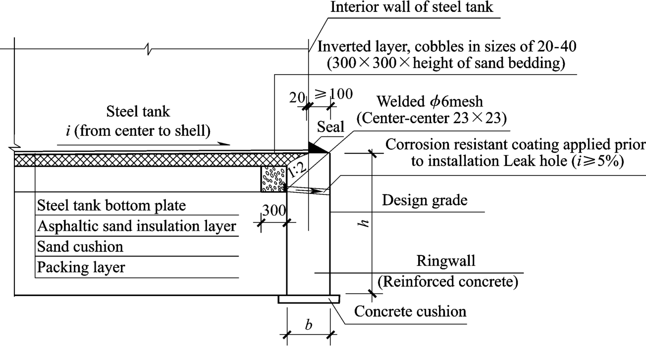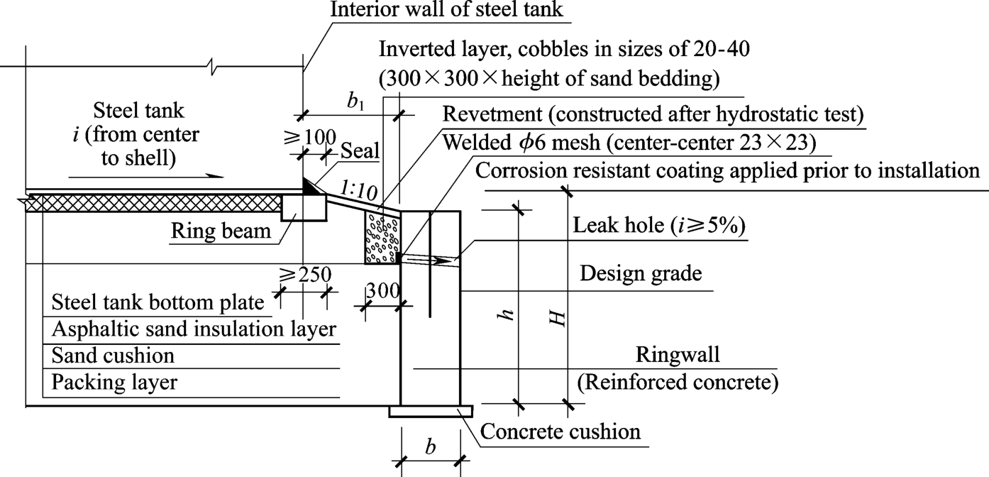 b —width of ringwall(m); h —height of ringwall(m); b 1 —distance from the inner side of outside ringwall to the inner side of tank shell(m); H —height from tank bottom to outside ringwall bottom(m)