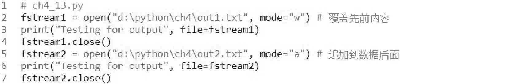 程序实例ch4_13.py:将数据输出到文档的实例,其中,输出到out1.txt采用“w”模式,输出到out2.txt采用“a”模式。