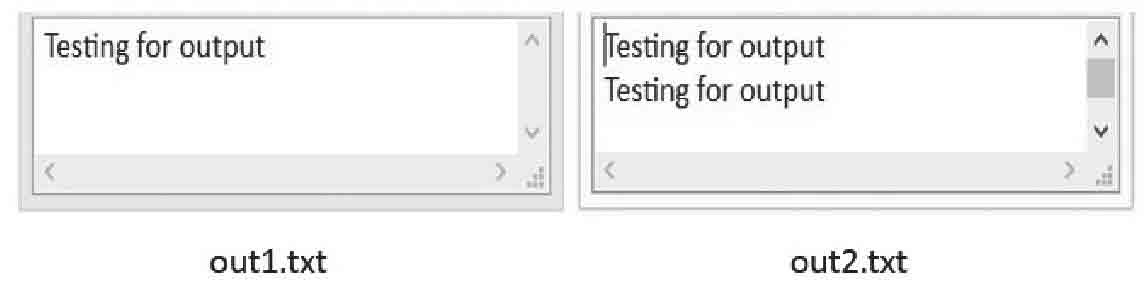 如果执行程序一次,可以得到内容相同的out1.txt和out2.txt。但是如果持续执行,out2.txt内容会持续增加,out1.txt内容则保持不变,下面是执行两次此程序后,out1.txt和out2.txt的内容。