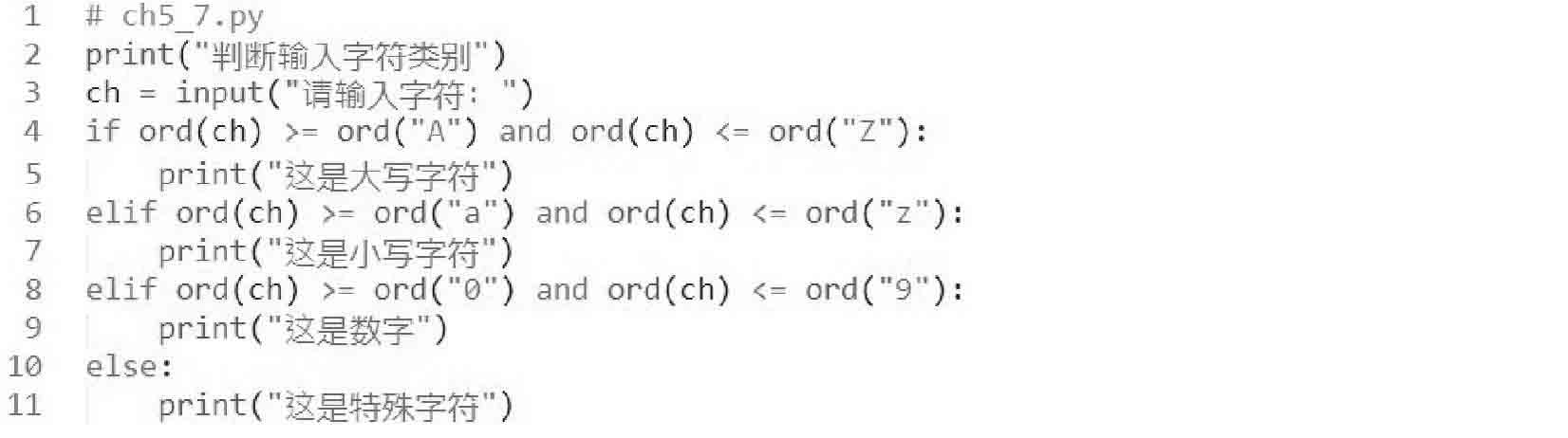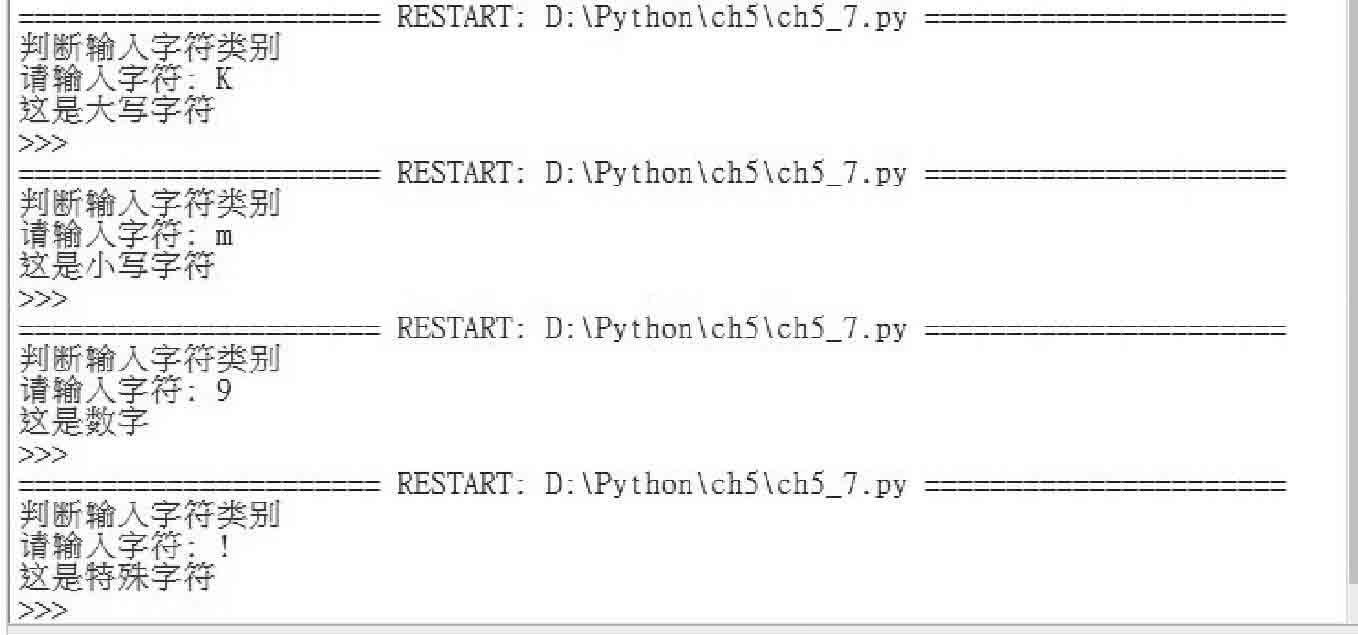 程序实例ch5_7.py:这个程序会要求输入字符,然后会告知所输入的字符是大写字母、小写字母、阿拉伯数字或特殊字符。
