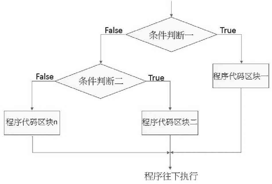 如果 条件判断一 是True则 执行程序代码区块一 ,然后离开条件判断。否则检查 条件判断二 ,如果是True则 执行程序代码区块二 ,然后离开条件判断。如果 条件判断 是False则持续进行检查,上述elif的条件判断可以不断扩充,如果所有条件判断是False则 执行程序代码区块n 。下列流程图是假设只有两个条件判断来说明这个if … elif … else语句。