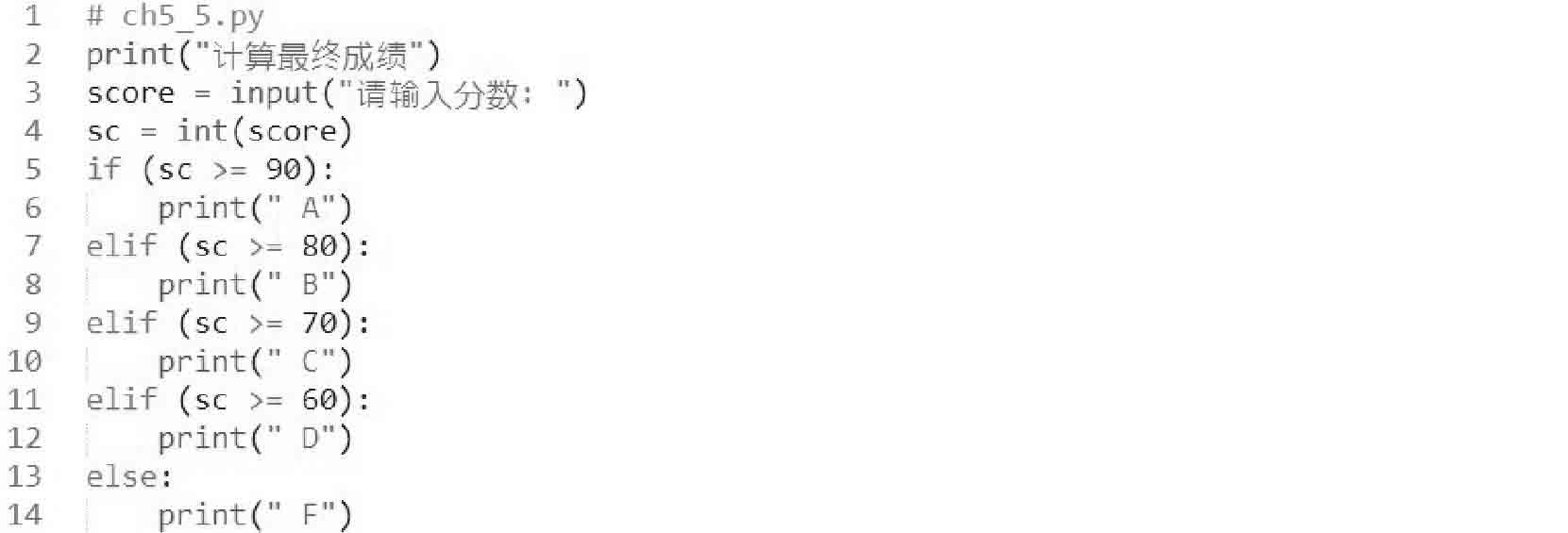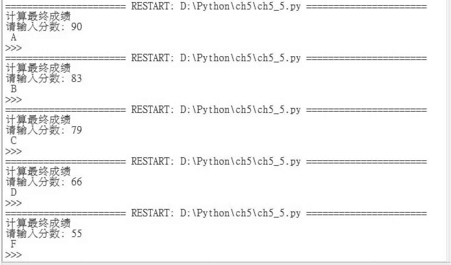 程序实例ch5_5.py:请输入数字分数,系统将响应A、B、C、D或F等级。