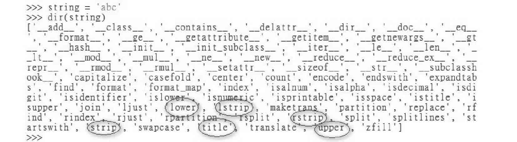 6-2-1节列举了字符串常用的 方法 ,dir()函数可以列出对象有哪些内建的方法可以使用。
