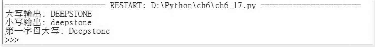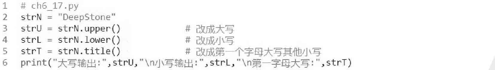 程序实例ch6_17.py:将字符串改成小写,将字符串改成大写,以及将字符串改成第一个字母大写,其他是小写。