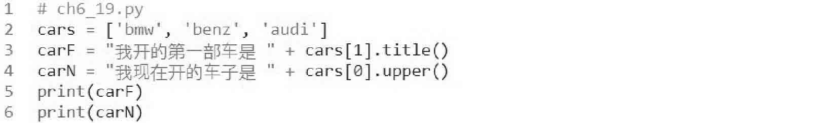 如果列表内的元素字符串数据是小写,例如,输出的车辆名称是“benz”,其实我们可以使用6-2-1节的title()让开头车辆名称的第一个字母大写,可能会更好。