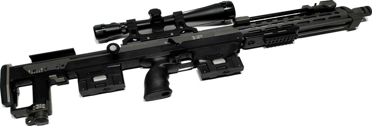 DSR-1狙击步枪系统是一款专门设计的专业狙击步枪,并非由猎用步枪或标准军用步枪修改而成,其使用了犊牛式设计,并且使用大量钛、铝合金和玻璃钢作为材料,以减轻其总重量。