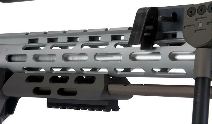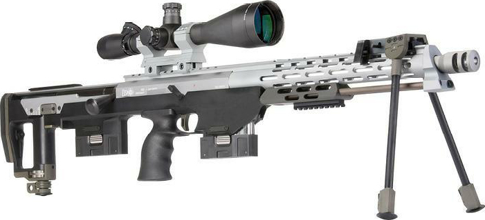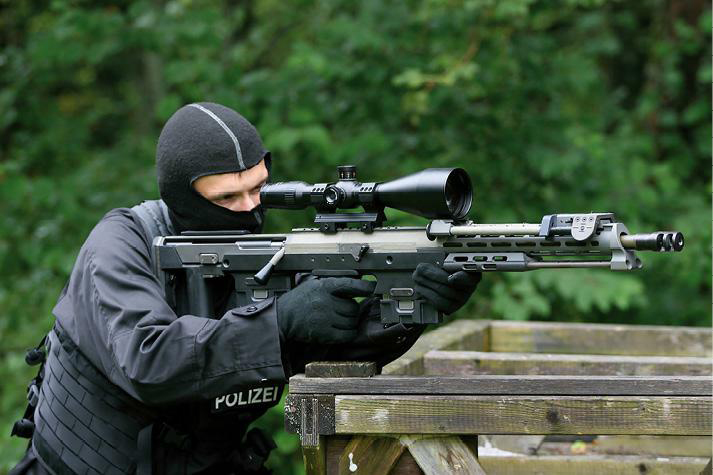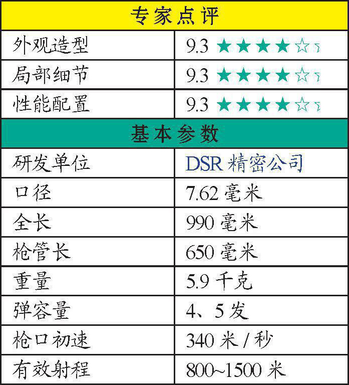 DSR-1狙击步枪大量采用了高技术材料,如铝合金、钛合金、高强度玻璃纤维复合材料,既减轻了重量,又保证了武器的坚固性和可靠性。该枪的精度很高,据说能小于0.2MOA。