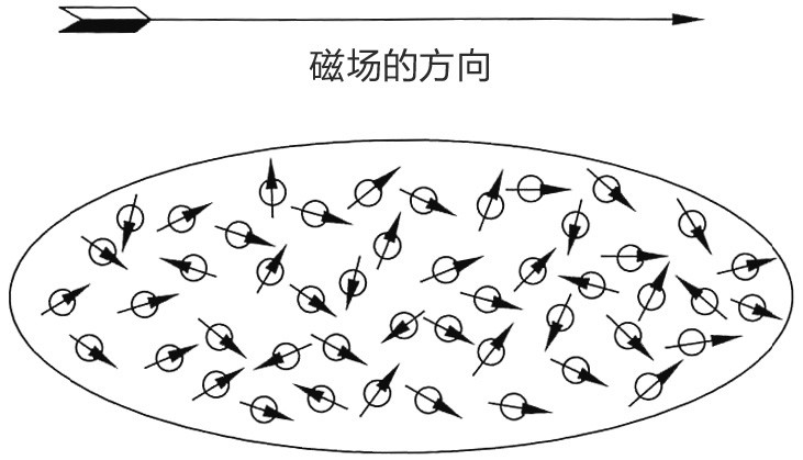 如果你在一根长方形石英管当中充满氧气,把它放到磁场中,你会发现这些气体会被磁化。之所以会发生磁化现象,原因是氧分子其实都是微小的磁体,进入磁场后会按照磁场方向平行排列,就像指南针一样。但是请不要认为它们全都按照磁场方向排列。如果你让磁场强度加倍,氧气的磁化程度也会加倍,磁化作用会随着磁场强度的增强而提高,当场强极高的时候,磁化的比例也能达到很高。