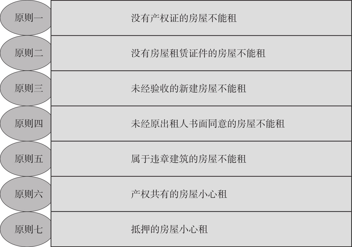 首先你应该明确什么样的房子能租,什么样的房子不能租。在选择房子时,要严格遵守以下几个原则(如图2-6所示),这样才能远离房屋租赁合同中的陷阱。