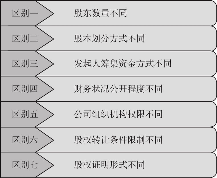 有限责任公司与股份有限公司相比较来说,除后者的注册流程比前者复杂得多,还存在以下几个方面的区别,如图1-3所示。
