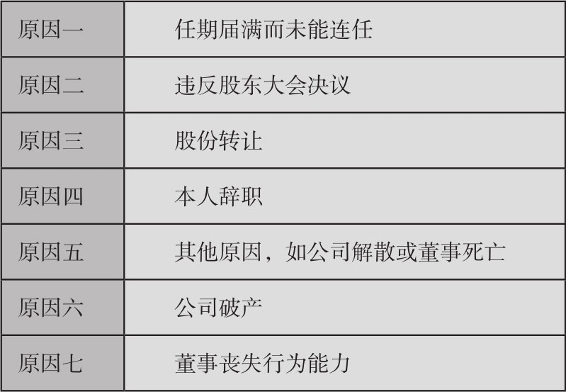 公司对董事的任职期限一般都会在公司内部细则中给出明确规定。任期分为定期和不定期两种。定期是指把董事的任期限制在一定的时间内,每届任期不得超过3年。不定期是指从董事任职那天算起,满3年就要改选,但可连选连任。公司有权解聘董事,其原因主要包括以下几个方面,如图1-8所示。