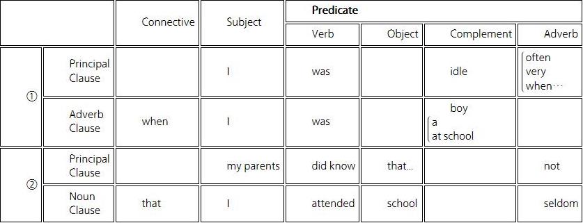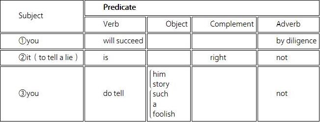 在语句的构成上,比这种形式问题更为重要的,自然是它的内容了。内容就是说它所包含的要素。一个完整的语句,起码要具备一个主语(Subject)和一个谓语(Predicate),例如“Birds fly.(鸟飞)。”前者为主语,后者为谓语,虽则简单,却已成为一个完整的语句了。如上举的“The boy works hard.”也是一样,the boy 是主语,works hard 是谓语。这是第一种句型,其公式是“Subject + Predicate”。其次是有宾语(Object)的语句,例如,“He has a book.”。因用 have 这个及物动词,一定要接上一个宾语,才能完成意义,你单说“他有”,听者便将产生疑问:他有什么呢?所以必须说出他有的东西来,才算是表达出一个完全的思想来了。这是第二种句型,其公式是“Subject + Predicate + Object”。有时在不及物动词后面,也接上一个词,但不是宾语,因不及物动词是不能有宾语的。比方说,“I am a boy.”。句中的 boy,并不是宾语,而是补语(Complement)。补语一定要和主语一致,如上句 I 就是 boy,boy 就是 I;而宾语和主语,则必然是两件事。宾语一定要是名词,而补语便不一定要是名词,有时形容词也可以,如“The flower is beautiful.”,便是用形容词做补语的。这是第三种句型,其公式是“Subject + Predicate + Complement”,我们又可以把宾语和补语,同时用在一句中,例如“We made him happy.”。句中的 we 是主语,made 是谓语,him 是宾语,happy 是补语。这是第四种句型,其公式是“Subject + Predicate + Object + Complement”。