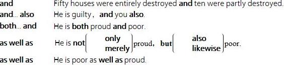〔说明〕单是把两个词句结合拢来,可用 and;要加强双方的意思,就用 both...and;至于用 not only...but also 来连接时,就是后者的意思比前者更强;用 as well as 时便要反转来说,因后者的意思是弱于前者的。