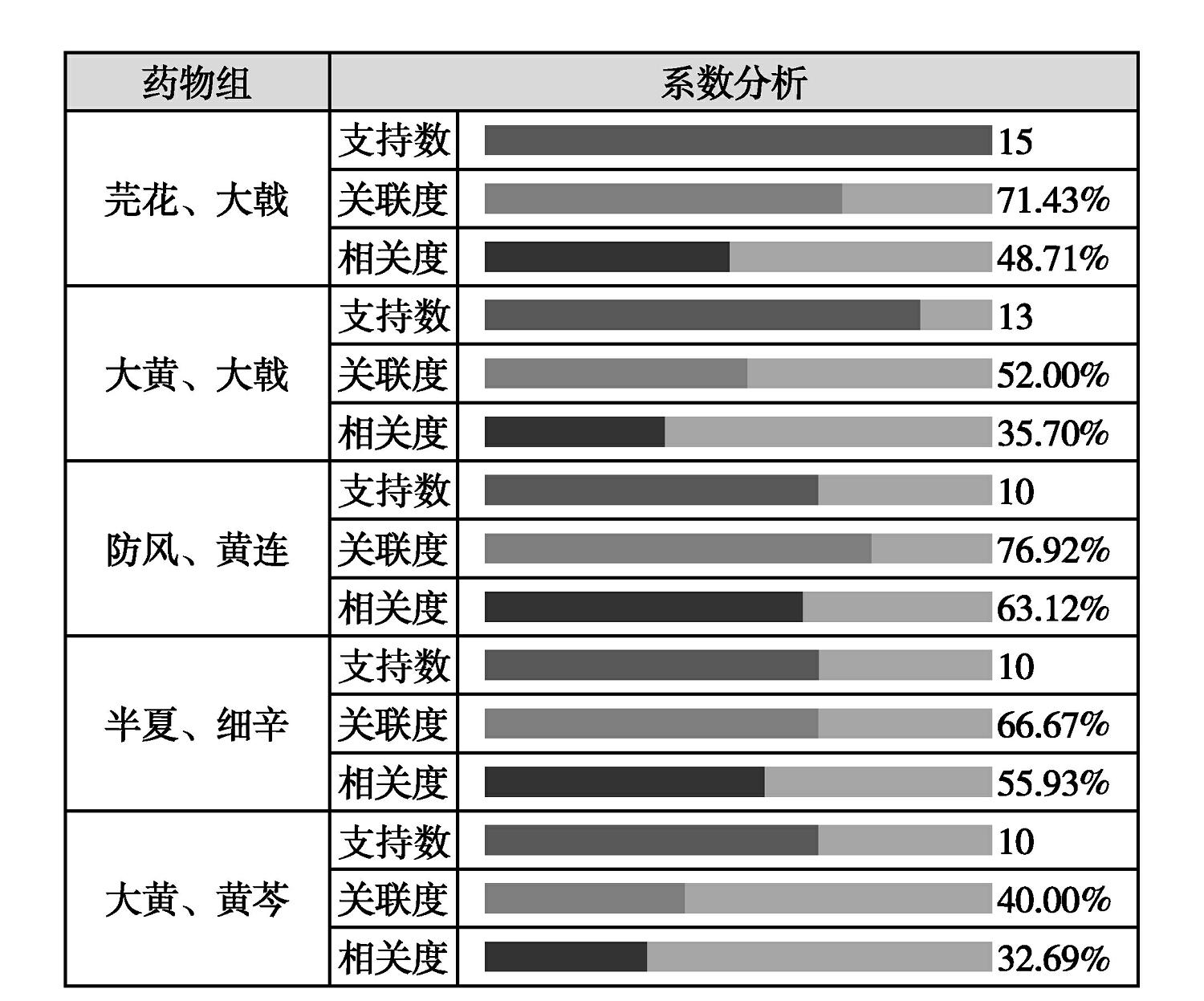 图2-2 甘遂、甘草反药同方配伍中的高频药对支持数、关联度、相关度
