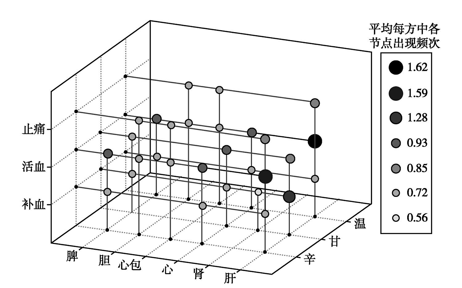 中药的性味归经基本反映了中药的功效和起效部位,因此有理由认为药物性味的作用主要表现在其各自的归经上,在其他归经上基本没有作用。也就是说,将药物性味代表的功效,作用于归经代表的部位。分别以归经和性味为横纵坐标,可以为方剂中出现的每味中药绘制性味归经分布图。