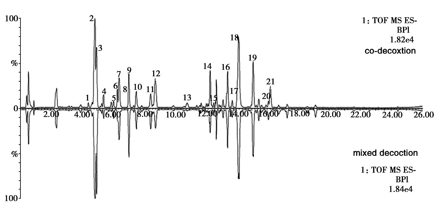 通过体外比较药材合煎与单煎化学成分的变化与差异,可以发现可能导致配伍禁忌的化学成分变化。由于药材中化学成分数量众多,结构复杂,一般可采用液—质联用分析方法,快速获得大量的化学成分信息,结合相对定量方法寻找合煎与单煎方式下发生变化的成分。也可借鉴代谢组学的研究方法,将合煎与单煎方式看作两组样本,借助化学计量学方法比较其成分差异,并快速获得差异成分信息。