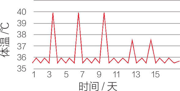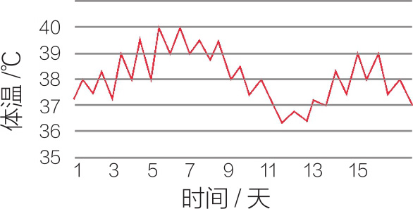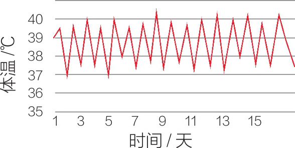 间歇热: 体温波动于高热与正常之间,高热时体温可达39℃以上,持续若干小时后降至正常,其后有一间歇期,经24小时、48小时或数日,体温又突然升高,如此反复发作,较有规律。常见于疟疾。