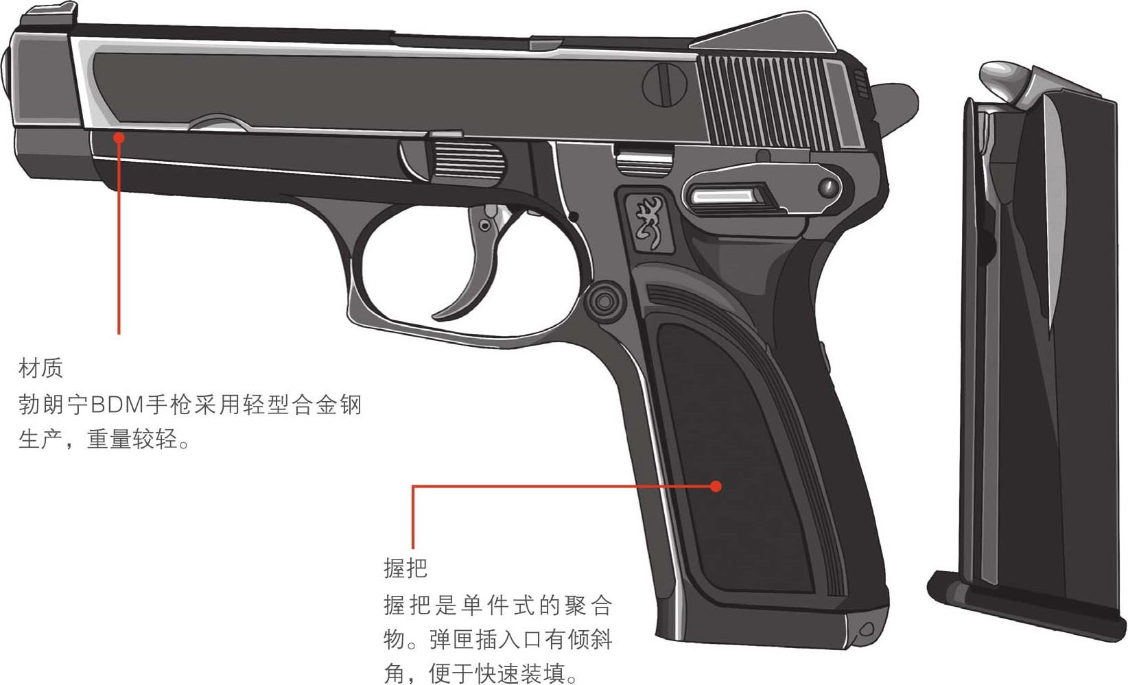 勃朗宁BDM手枪经常会被人误归类到勃朗宁HP手枪中,实际上BDM手枪只是外形类似HP手枪,其实两者有不同的设计。